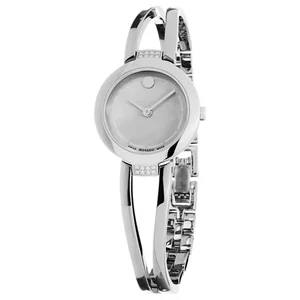 Movado 0606813 Women's 'Amorosa' Mother of Pearl Dial Stainless Steel Diamond Bangle Swiss Quartz Watch Movado 0606813 Women's 'Amorosa' Mother of Pearl Dial Stainless Steel Diamond Bangle Swiss Quartz Watch features a stainless steel 25.2mm case, a mother of pearl dial, and a sapphire crystal. The 12mm stainless steel bangle set with diamond band is fitted with a jewelry clasp. This wrist watch is powered by Swiss Quartz movement. This watch has a water resistance of up to 100 feet/30 meters, suitable for short periods of recreational swimming. Features: Brand: Movado Model number: 0606813 Case Shape: Round Dial window material type: Sapphire Display Type: Analog Clasp: Jewelry Clasp Case Material: Stainless steel Case diameter: 25.2 millimeters Case Thickness: 6 millimeters Band Material: Stainless Steel Bangle set with Diamonds Band length: 7 inches Band width: 12 millimeters Band Color: Silver-tone Dial Color: Mother of Pearl Bezel Material: Stainless Steel Bezel Function: Fixed Movement: Swiss Quartz Water-resistant depth: 30 meters UPC: 885997114165 Movado 0606813 MSRP: $ 995