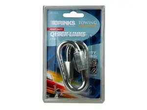 These Heavy Duty Quick Links by Brinks are designed for secure and reliable connections between chains. With an impressive working load limit of 1760 lbs, these quick links are perfect for various heavy-duty applications. Each pack includes two heavy duty quick links, each measuring approximately 2.75" x 1.25". They come conveniently packaged in a 5.25" x 3.25" blister pack for easy storage and transport.
