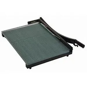 Heavy-duty paper trimmer is specially made to accurately cut paper, matte board, cardboard, film, tissue and textiles. Through-hardened steel blades precision-angle cut up to 30 sheets at once. Heavy, 3/4" wood base offers a permanent, 1/2" alignment grid and dual Imperial/metric rulers for precise cuts. For safety precautions, the patented, automatic blade latch locks with every cutting motion. Safety features also include finger guard to protect the entire length of the blade. Torsion spring prevents blade from accidentally falling during operation. Hand-operated clamp holds items securely for accurate cutting. Design also offers an ergonomic, soft-grip hand grip for comfort and nonskid rubber feet.