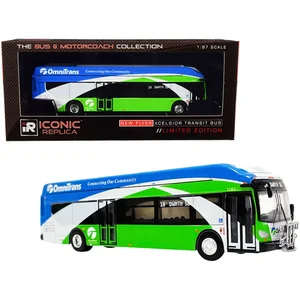 This detailed diecast model represents the New Flyer Xcelsior XN40 Transit Bus, featuring the #10 OmniTrans (San Bernardino) design with green, blue, and white stripes. Perfect for collectors and enthusiasts, this exquisitely crafted model is part of 'The Bus & Motorcoach Collection' from Iconic Replicas.