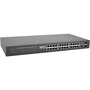 The energy-efficient NGS24C2 24-Port Gigabit L2 Web-Smart Managed Network Switch from Tripp Lite features 24 twisted-pair RJ45 Gigabit Ethernet ports that support auto-negotiable 10/100/1000 Mbps and auto MDI/MDIX cross-over detection functions for convenient plug-and-play capability. Two dedicated mini-GBIC SFP ports are also included for uplinking data to other switches via optical fiber or copper. Easy-to-read LEDs indicate connection and activity status for each port. Built-in web-smart management software lets you monitor and control each connected device via secure web-based interface. Each port supports up to 2 Gbps with full duplex. The heavy-duty metal housing mounts into 1U of an EIA-standard 19-inch rack using the included brackets and user-supplied hardware. Or attach the included rubber feet to the bottom of the unit for installation on a flat desktop surface. The five-foot input cord with NEMA 5-15P plug connects to a protected UPS, generator or mains input AC source.