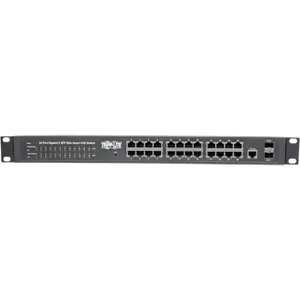 Enterprise Managed Network Switch24 twisted-pair RJ45 Gigabit Ethernet ports for connecting data-intensive devicesAuto-negotiable 10/100/1000 MbpsAutomatic MDI/MDIX cross-over detection52 Gbps switching capacity (2 Gbps per port with full duplex)Easy-to-read LEDs indicate connection and activity status for each portSupports 9k jumbo framesSupports MAC address auto-learning and auto-aging up to 8,000 addressesAdvanced Enterprise-level and L2 management features300W Total PoE+ Budget Each RJ45 port can be configured to supply in-line power to connected devices, such as VoIP phones, wireless access points and security cameras 30W maximum per portBuilt-In Web-Smart Management Software Remote access allows monitoring and control of connected equipment via simple Web interface VLAN, trunking, VPN, port monitoring and other features improve network efficiency and performanceDual Dedicated Mini-GBIC SFP Ports Connect to Mini-GBIC SFP modules for uplinking to other switches via optical fiber or copper LEDs indicate interface trafficCompliant with IEEE Standards Meets IEEE 802.3ab, 802.3i, 802.3u, 802.3x, 802.3, 802.1q, 802.1p, 802.3af and 802.3at standardsVersatile Installation Options Fanless metal housing mounts in 1U of EIA-standard 19 in. racks Supports desktop installation using included rubber feet on flat surface 5 ft. power cord with NEMA 5-15P plug connects to compatible AC power sourceElectrical Consumption 450 watts max.