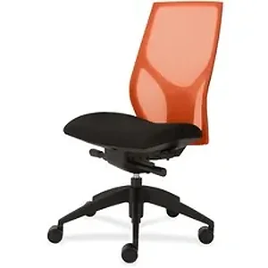 Vault Task Chair with no arms goes beyond the expected with features that let you personalize your comfort. Uncommon for a mesh back design, ratchet back-height adjustment lets you raise or lower the backrest for the greatest comfort. High-quality, woven tension mesh in orange conforms to your back, following every move with support, including the lumbar region. Advanced, K2 knee-tilt control includes side-tension adjustment and three-position lock. Seat slider adjusts the seat depth from 16" to 18-1/2" so you are just where you need to be. Other functions include pneumatic seat-height adjustment from 18-1/2" to 21-1/2" and 360-degree swivel. High-resilient, molded foam seat features a waterfall seat front to promote circulation and good health. 20" wide seat is upholstered in Onyx fabric. Durable, black nylon base with five casters offers long, trouble-free service. Weight capacity is 300 lb.