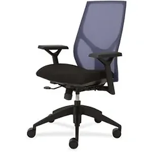 Vault Task Chair goes beyond the expected with features that let you personalize your comfort. Uncommon for a mesh back design, ratchet back-height adjustment lets you raise or lower the backrest from 23" to 25-1/2" for the greatest comfort. High-quality, woven tension mesh in blue conforms to your back, following every move with support, including the lumbar region. Seat slider adjusts the seat depth from 16" to 18-1/2" so you are just where you need to be. Y-shaped arms adjust in height with a ratchet mechanism. Other functions include upright tilt lock, 3:1 back-to-seat tilt ratio, center knob tension adjustment, pneumatic seat-height adjustment from 17-1/2" to 22-1/2" and 360-degree swivel. High-resilient, molded foam seat features a waterfall seat front to promote circulation and good health. 20" wide seat is upholstered in Onyx fabric. Durable, black nylon base with five casters offers long, trouble-free service. Weight capacity is 300 lb.