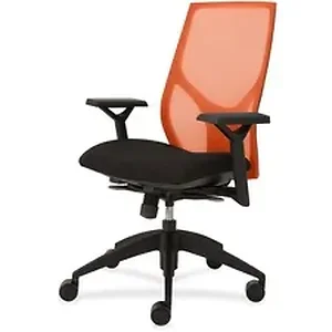 Vault Task Chair with full synchro tilt goes beyond the expected with features that let you personalize your comfort. Uncommon for a mesh back design, ratchet back-height adjustment lets you raise or lower the backrest from 23" to 25-1/2" for the greatest comfort. High-quality, woven tension mesh in orange conforms to your back, following every move with support, including the lumbar region. Seat slider adjusts the seat depth from 16" to 18-1/2" so you are just where you need to be. Y-shaped arms adjust in height with a ratchet mechanism. Other functions include three-position tilt lock, 2:1 back-to-seat tilt ratio, center knob tension adjustment, pneumatic seat-height adjustment from 17-1/2" to 22-1/2" and 360-degree swivel. High-resilient, molded foam seat features a waterfall seat front to promote circulation and good health. 20" wide seat is upholstered in Onyx fabric. Durable, black nylon base with five casters offers long, trouble-free service. Weight capacity is 300 lb.