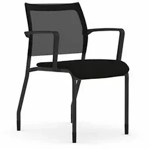 This guest chair with arms is part of 9 to 5 Seating's Luna Collection that delivers smart space-conscious and style-forward design. Ergonomic design merges comfort and refinement with a wall-saver black frame; cushioned seat upholstered in Onyx fabric; breathable, black mesh back for support and matching black arms. Built for easy coordination, the Luna Side Chair is the perfect companion for an office, cafe or anywhere else you team up. It easily goes where you need it to, using the integrated pull handle at the top edge. Chair stacks up to five high on the optional dolly (not included) or on the floor. Seat measures 18-1/2" wide x 17" deep x 18-1/2" high. Back size is 19-1/2" wide x 16" high. Weight capacity is 300 lb.
