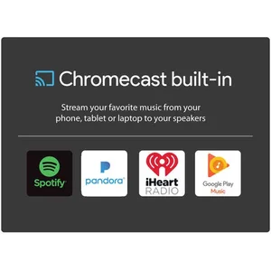 • 30 watts RMS output power (2 x 15 watts);• Frequency response: 30 Hz to 20 kHz;• Bluetooth(R) connectivity plus Chromecast(TM) built-in for audio streaming; designed to work with the Google Home(TM) app, Chromecast(TM) app, as well as Spotify(R) Connect app on phone, tablet, or laptop;• Multi-room streaming and wireless control from anywhere in your house with Chromecast(TM) built-in;• Hi-Res Audio compatible so you can stream lossless audio from the web capable of reproducing higher quality sound;• 2.5-in. speakers;• 3.5-mm stereo aux input for connecting additional audio sources like MP3 players;• Includes 120-volt AC adapter;