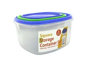 This set includes 3 square clear plastic storage containers, each with a plastic lid available in blue and green. These containers are designed to be stackable and feature airtight, easy-open lids.