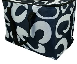 This cooler bag features a zippered top for easy access, ample space for food and beverages, and a comfortable 9-inch drop handle for carrying. Measuring approximately 15" x 9.5" x 11", it comes in assorted prints, making it both functional and stylish.