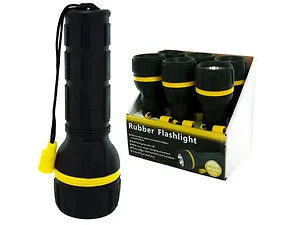 Be prepared for any emergency with this heavy duty water resistant flashlight. Its anti-roll design ensures it stays put, and the included carrying strap makes it easy to transport. Easily turn the flashlight on or off with the simple press button. Ideal for use in your car trunk, garage, kitchen drawer, or anywhere you need extra illumination. Each flashlight requires 2 'D' batteries (not included) and measures approximately 8 inches long, with a 7.5-inch hanging strap. This countertop display includes 6 flashlights to ensure you're always equipped with a reliable light source.