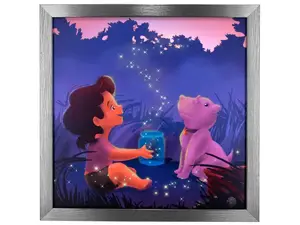 When activated, the artwork beautifully lights up and plays the gentle tune of "Firefly Nights," providing comfort at bedtime. The art is crafted from high-quality canvas and framed in an elegant silver plastic frame, making it a charming addition to any decor.