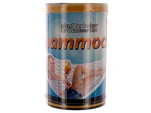 Ideal for camping, traveling and backpacking or garden and backyard lounging, this Nylon Hammock is constructed from heavy nylon cord mesh and includes steel rings and hanging ropes. Supports up to 250 pounds. Comes in assorted colors. Comes packaged in an individual round box. Box measures approximately 5.625" tall x 3.5" in diameter.