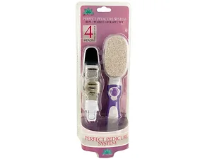 Keep feet in tip top condition with this Perfect Pedicure System Set. A quick release handle with four interchangeable heads to exfoliate, buff, polish and file will easily make feet soft and smooth. Includes one pumice smoothing head, one double-sided emery board polishing pad, one callous shaving blade and one metal filing head. Comes packaged in a hanging clam shell.