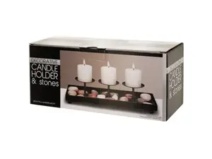 Enhance the tranquility of your space with our Stylish Metal Candle Holder with Stone Accents. This elegant set features a modern design featuring a black metal candle holder equipped with three pedestals, perfectly suited for your favorite candles. Surround the pedestals with natural stones to create a serene ambiance in any room.
