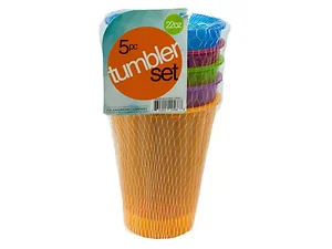 Perfect for parties, camping and everyday use, this colorful 5-piece 22-ounce Plastic Tumbler Set is great to use all year round for any occasion. Each piece measures approximately 4.75" x 4" x 2.5" and nests into each other for compact storage. Tumblers come in five bright colors: lime green, aqua, purple, yellow and red. Comes packaged in a net bag.