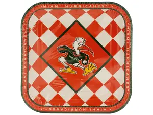 Enhance your game day experience with the Miami Hurricanes Lunch Plates Set. This 8-piece set includes square plates adorned with a vibrant orange and white checkered design, accented with the iconic Hurricanes logo and "Miami Hurricanes" text. Perfect for parties, tailgates, and everyday meals, these plates measure approximately 9" x 9" and come shrink wrapped for your convenience.