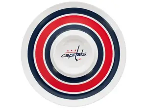 Elevate your game day gatherings with this NHL Licensed Washington Capitals Chip & Dip serving dish. Designed for both parties and casual meals, this round plastic dish features vibrant red and blue stripes along the edge, alongside a prominent Capitals logo in the dip section.