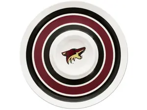 Enhance your game day experience with this Arizona Coyotes Chip & Dip plate. Designed for fans, this NHL licensed product features a stylish round dish with vibrant black and maroon stripes. The center dip section measures 5.5 inches and proudly displays the Coyotes logo, making it perfect for serving snacks during parties or casual gatherings.