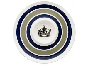 This NHL Licensed Los Angeles Kings Chip & Dip Bowl is perfect for parties and everyday use. It features a stylish round white plastic dish adorned with dark blue and grey stripes, including a 5.5" center dip section showcasing the iconic Kings logo. With a diameter of approximately 14", this bowl is dishwasher safe for easy cleanup and adds a festive touch to any gathering.