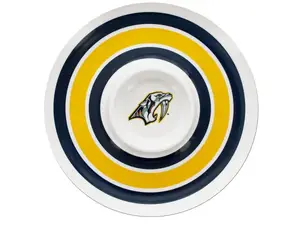 Elevate your game day gatherings with this NHL Licensed Nashville Predators Chip & Dip serving dish. Crafted from durable white plastic, this stylish dish features vibrant dark blue and yellow stripes, along with a prominent Predators logo in the center. Measuring approximately 14 inches in diameter, it includes a 5.5-inch dip section, perfect for your favorite snacks. Suitable for both parties and everyday use, this serving dish is dishwasher safe for easy cleanup.