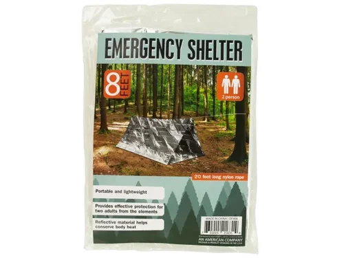 Great to have on hand in case of emergencies, this 2 Person Emergency Shelter provides effective protection from the elements for two adults. Portable, lightweight design features reflective material that helps conserve body heat. Simply unfold and tie the shelter to trees or posts to form a tent. Measures approximately 8' long with a 20' long nylon rope. Comes packaged in a hanging poly bag.