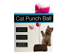 Keep your cat busy for hours with this Cat Punch Ball Toy with Furry Base, a great interactive toy cats will love. Fun design features a soft, colorful spring toy to entice cats to play and scratch on a brown faux fur base. Measures approximately 5.5" x 5.5" x 11". Comes packaged in an individual box. Box measures approximately 5.5" x 1.5" x 5.5".