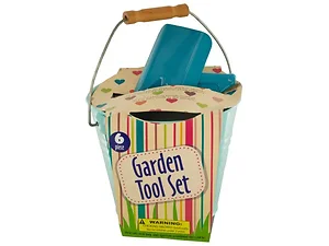 Ideal for light gardening or introducing kids to growing plants, this 6-piece Garden Tool Set features metal tools with a light blue finish in a convenient bucket with a wooden handle. Includes: one tin bucket, one 8.5" shovel, one 6" hand rake and three plastic plant markers. For ages 5 and up. Comes packaged with a wrap around.