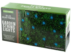 Make your garden glow with this Blue Solar Powered LED String Lights Set featuring 50 blue lights with flashing and static light functions and a remote solar panel with a rechargeable battery. Lights automatically turn on at dusk. No wiring required. Comes packaged in an individual box. Box measures approximately 8.75" x 2.25" x 4.625".