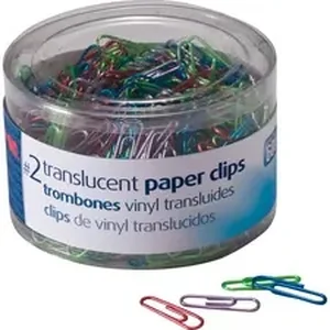 Translucent Vinyl Paper Clips won't leave marks on paper. Paper clips offer superior holding power with a translucent metallic finish. Assorted colors include blue, purple, green, red and silver.