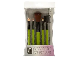 Great for creating neutral or bold looks at home or on the go, this 5-piece Cosmetic Brush Set features an assortment of plastic and metal tools with lime green "love" print handles and a silver mesh zipper case to keep them organized in. Set includes: 1 blush brush, 1 eyeshadow brush, 1 lip brush, 1 eyeshadow sponge tool and 1 zipper case. Comes packaged in a hanging box.