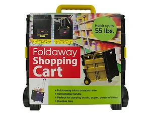 Perfect for carrying groceries, books, paper, personal items and more, this Foldaway Shopping Cart features a plastic cart with a retractable handle and durable tires that folds into a compact size. Holds up to 55 pounds. Folded size: 15" x 14" x 3". Open size: 15" x 14" x 13". Comes packaged with a wrap around.