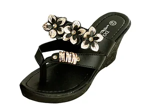 Step out in style with our Elegant Black Floral Wedge Sandals, featuring beautiful gold and jewel accents. These sandals are designed for both dress-up occasions and everyday casual wear.