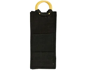 This Stylish Black Burlap Wine Tote with Bamboo Handles is the perfect companion for transporting your favorite bottles of wine or accessories. Its durable woven construction ensures longevity while the four outer slip pockets provide additional storage for wine tools or snacks. The round bamboo handles not only add a touch of elegance but also make carrying easy and comfortable, thanks to the 3.5-inch drop. Featuring an interior with a water-resistant coating, this tote protects your items from spills and moisture.