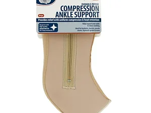 This Adjustable Compression Ankle Support is expertly designed for relief from tendinitis, bursitis, muscle strains, and ligament sprains. Constructed from soft beige neoprene infused with high-quality quadstretch elastic, it allows for natural 4-way movement. The integrated durable zipper facilitates effortless application and removal, ensuring a snug fit that enhances comfort.
