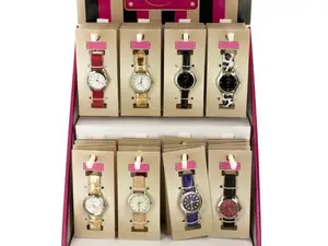 Elevate your accessory game with our Stylish Ladies' Fashion Watch Display. Perfect for both dressy and casual occasions, this display features a diverse selection of high-quality watches that boast quartz accuracy and smooth second-hand movement. Each watch is designed with elegance, showcasing bands made from faux crocodile leather, solid and printed faux leather, and more.