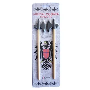 Get medieval on your mistakes with this 2-piece Medieval Axe Erasers Pencil Set featuring natural wood pencils topped with gray axe-shaped erasers. It's always fun to write and draw with pencils, and now you can attack your mistakes with these fun axe erasers! For ages 3 and up. Comes packaged in a blister pack.