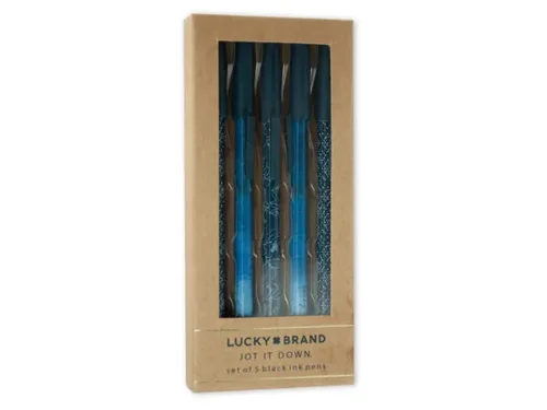 Enhance your writing experience with the Lucky Brand 5-Piece Set of Stylish Black Ink Pens. Perfect for jotting down class notes, brainstorming ideas, or reminding yourself of important tasks, these pens feature a unique design with indigo dot and watercolor prints. The set comes beautifully packaged in a compact box that measures approximately 6.75" x 3" x 0.75", making it an ideal gift or desktop accessory.