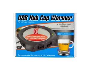 Keep beverages warm on your desk and charge devices at the same time with this 4 Port USB Hub Cup Warmer featuring a compact unit that keeps beverages warm at 122 to 140 degrees Fahrenheit and has 4 standard USB ports for convenient charging. Warmer is recommended for cups up to 2.75" in diameter. Plug-in cord measure approximately 36.5" long. Comes packaged in an individual box. Box measures approximately 5.75" x 1.375" x 4.125".