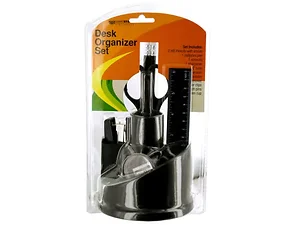 Stock your work station with essentials with this space-saving Desk Organizer Set featuring commonly used office items in a convenient round caddy. Set includes: 2 HB pencils with erasers, 1 ballpoint pen, 1 scissors, 1 pencil sharpener, 1 6" ruler, 1 eraser, 1 stapler, 1 staple remover, 10 paper clips, 5 push pins and 1 pen cup. Comes packaged in a clam shell.