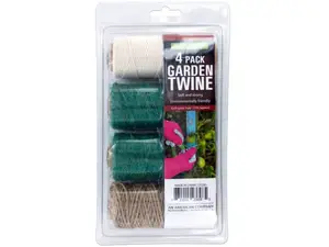 Easily tie plants to stakes, make bouquets and more with this 4-piece Garden Twine Spool Set featuring strong, durable 3-ply twine and soft cotton string in various thicknesses and colors on convenient spools. Each spool measures approximately 4.375" long x 1.75" in diameter and holds approximately 115' of twine. Comes packaged in a clam shell.