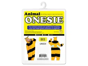 Enjoy ultimate comfort with our Cozy Bee & Frog Animal Onesies designed for adults. Made from ultra-soft fleece, these onesies feature charming animal designs complete with embroidered details and convenient pockets. Ideal for parties, loungewear, or as fun costumes, they provide warmth and coziness. Available in assorted sizes and styles: Bee and Frog. Easy to care for, these onesies are machine washable and come packaged in a hanging poly bag.
