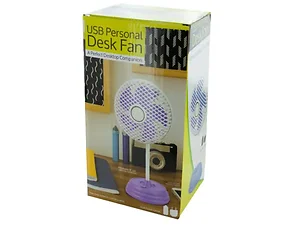 Perfect for cooling off at your computer, this USB Personal Desk Fan features a classic, compact design with high output, caged blades and silent operation. Operates with included USB cable or 3 'AA' batteries (not included). Easy on/off push button. Measures approximately 11" tall with a 5.5" diameter fan head. Comes in assorted colors: red, purple and blue. Comes packaged in an individual box. Box measures approximately 5.5" x 4.625" x 9.75".