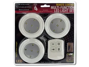 This versatile 4-piece Remote Control LED Lighting Set is designed to brighten up power outages and dark spaces. Each ultra-bright round light can be easily operated using the included remote control or by simply pressing the lights. The set features dimmer control for adjustable brightness and a convenient 30-minute timer. Perfect for home use, these lights allow for hassle-free installation with self-adhesive stickers.