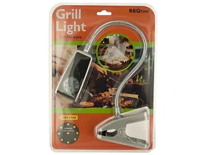 Grill like a pro in any light condition with this Barbecue LED Grill Light featuring a super bright push button light with 9 LED bulbs, a long, flexible neck and a strong, durable clip. Light head measures approximately 4" x 1.125" x 1.875" with a 13" long neck. Clip base measures approximately 4.25" x 3" x 1.875". Requires 3 'AAA' batteries (not included). Comes packaged in a clam shell.