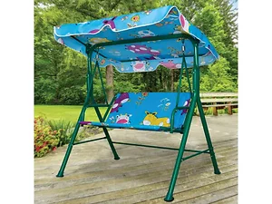 Perfect for relaxing outdoors under shade, this Kids Canopy Swing Bench features a green powder-coated steel frame with a padded seat and canopy made of durable nylon in a fun print. Swing seat is connected with heavy duty metal springs. Sits 2-3 children comfortably. Weight capacity: 175 pounds. Measures approximately 41" x 29.5" x 41". Comes in assorted styles: blue animal print and red multi-colored print. Comes packaged in an individual box. Box measures approximately 42" x 3" x 18".