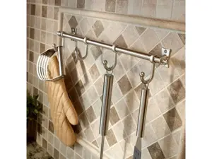 Add a stylish accent to your kitchen with the Liberty Essick Modern Hook Rail. This elegant metal rail features a beautifully contoured design, equipped with four hooks for easy access to hand towels, potholders, and kitchen utensils. Its sleek construction allows you to make the most of the space between your countertops and cabinets, ensuring a tidy and organized cooking area.