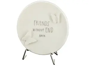 This Decorative Porcelain Friends Without End Plate is a heartfelt gift that symbolizes love and enduring friendship. The small white porcelain plate showcases beautiful engraved floral designs, delicate raised butterfly accents, and the touching phrase "Friends without end. Amen" inscribed at the bottom. Accompanied by a sturdy metal wire plate stand, this charming piece is perfect for display in any home.