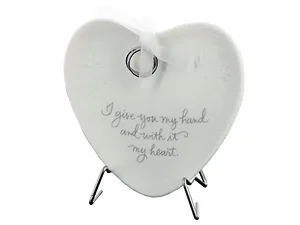 Celebrate love and commitment with this beautifully crafted Ceramic Heart Plate ideal for weddings. The plate features an exquisite heart shape adorned with floral engravings and is finished with a delicate white ribbon bow. Two silver-tone rings dangle gracefully from the ribbon, symbolizing unity. At the bottom, the heartfelt phrase, "I give you my hand and with it my heart," adds a personal touch.