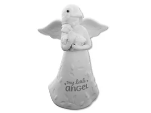 The base of the dress features the sentiment "Mi Pequeno Angelito", making it a meaningful keepsake. Standing at approximately 5.25" tall and 3.5" wide, this figurine is a lovely addition to any decorative collection.
