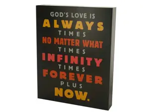Bring blessings to your space with this God's Love is Infinite Box Print Wall Art featuring a black wooden box printed with the phrase "God's love is always times no matter what times infinity times forever plus now" in yellow, orange, red and grey. Art easily mounts to walls with metal sawtooth hanger on back. Measures approximately 8" x 1.5" x 10". Comes loose.
